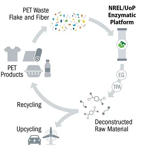 NREL-yliopiston ja UoP:n tutkijat ovat kehittäneet kustannustehokkaan, ympäristöystävällisen entsymaattisen alustan, joka voi nopeasti hajottaa kulutuksen jälkeisen PET:n identtisiksi kemiallisiksi rakennuspalikoksi, tereftaalihapoksi (TPA) ja etyleeniglykoliksi (EG).